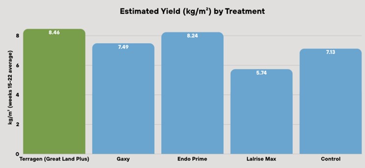 In a large commercial glasshouse trial, Great Land Plus® delivered the highest estimated yield (8.46 kg/m²), driven by heavier average fruit weight and improved crop balance. Earlier truss expression and improved fruit sizing highlighted GLP’s value in intensive horticultural systems.
